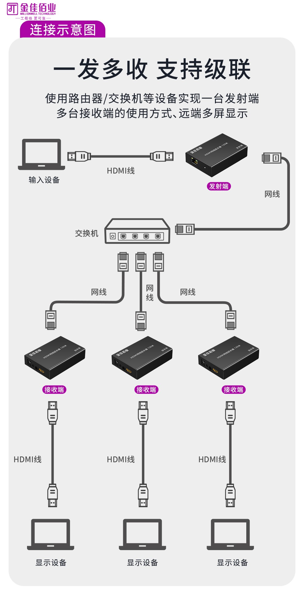 3.支持進(jìn)交換機(jī)級(jí)聯(lián),一發(fā)多收多屏顯示;