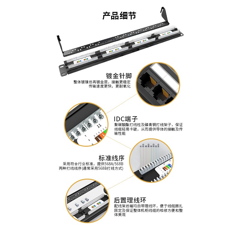 3. 標準線序,所有插座都具備T568A和T568B兩種線序,適用所有19英寸標準機柜,后置理線環(huán)