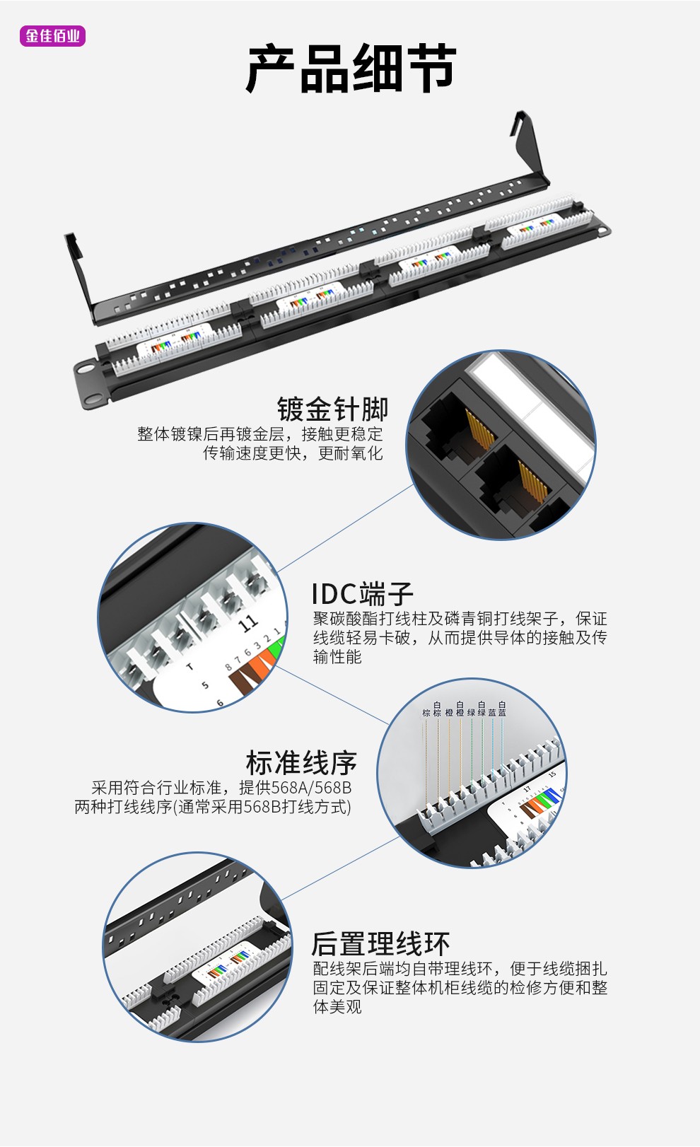 標(biāo)準(zhǔn)線序,所有插座都具備T568A和T568B兩種線序,適用所有19英寸標(biāo)準(zhǔn)機(jī)柜,后置理線環(huán)