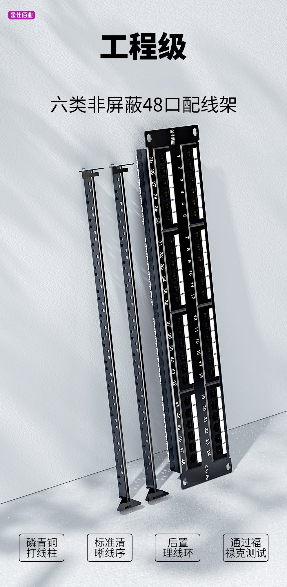 3. 標(biāo)準(zhǔn)線序,所有插座都具備T568A和T568B兩種線序,適用所有19英寸標(biāo)準(zhǔn)機(jī)柜,后置理線環(huán)