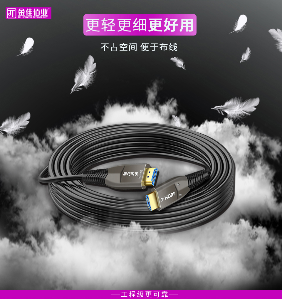 金佳佰業(yè)光纖HDMI線外徑僅4.5mm,徹底結(jié)束了銅芯線又粗又重的外觀歷史,更適合狹小空間安裝施工使用。而且光纖線自身十分柔軟、抗彎抗折(不宜90度彎折),方便施工鋪設(shè),更適合綜合布線工程中大面積埋線。