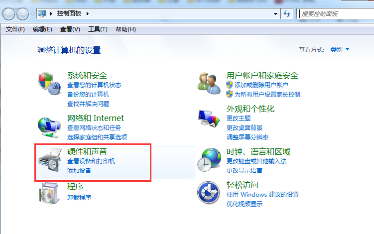 1、點擊電腦右下角 “開始”鍵,進入控制面板,然后點擊“硬件和聲音”;