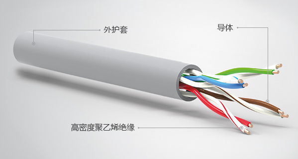 如下圖所示,超五類網(wǎng)線主要由三個物件組成,外殼、線殼以及銅線導體,銅線導體到八根。每根銅線導體外面的線殼都有自己對應的顏色。