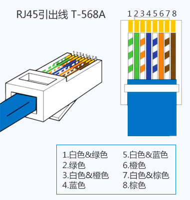 T568A標準的排序方式為:白綠、綠、白橙、藍、白藍、橙、白粽、棕 。如下圖所示。