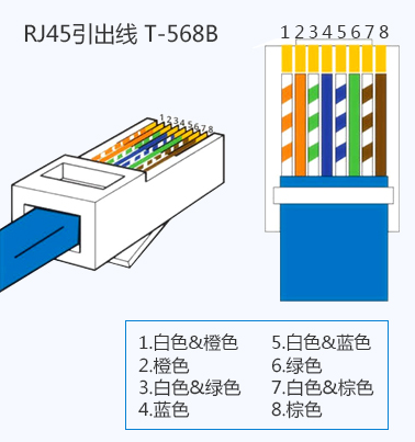 T568B標準的排序方式為:白橙、橙、白綠、藍、白藍、綠、白粽、粽 。如下圖所示。