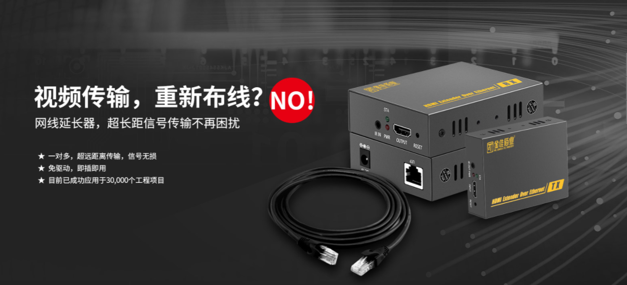 金佳佰業(yè)網線延長器打破距離限制,采用單條CAT5E/6類網線連接,真正實現(xiàn)單網線延長120米,畫面無損傳輸,在使用上給您帶來更多便捷與靈活性。金佳佰業(yè)延長器采用HDMI網絡分配技術,借助網絡分配產品(路由器,交換器),可以實現(xiàn)一臺發(fā)射端連接多臺接收端使用,實現(xiàn)多屏同時展示。