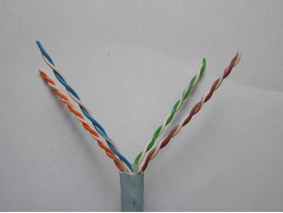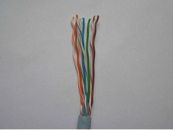 將線纜解紐,由于解紐直接影響到性能,所以應(yīng)注意解紐的長(zhǎng)度不能太長(zhǎng),并將解紐后的導(dǎo)線理直,將導(dǎo)線按568B(白橙、橙、白綠、藍(lán)、白藍(lán)、綠、白棕、棕)或568A(白綠、綠、白橙、藍(lán)、白藍(lán)、橙、白棕、棕)(從左向右排)的順序理齊,不要讓線彎彎曲曲的。